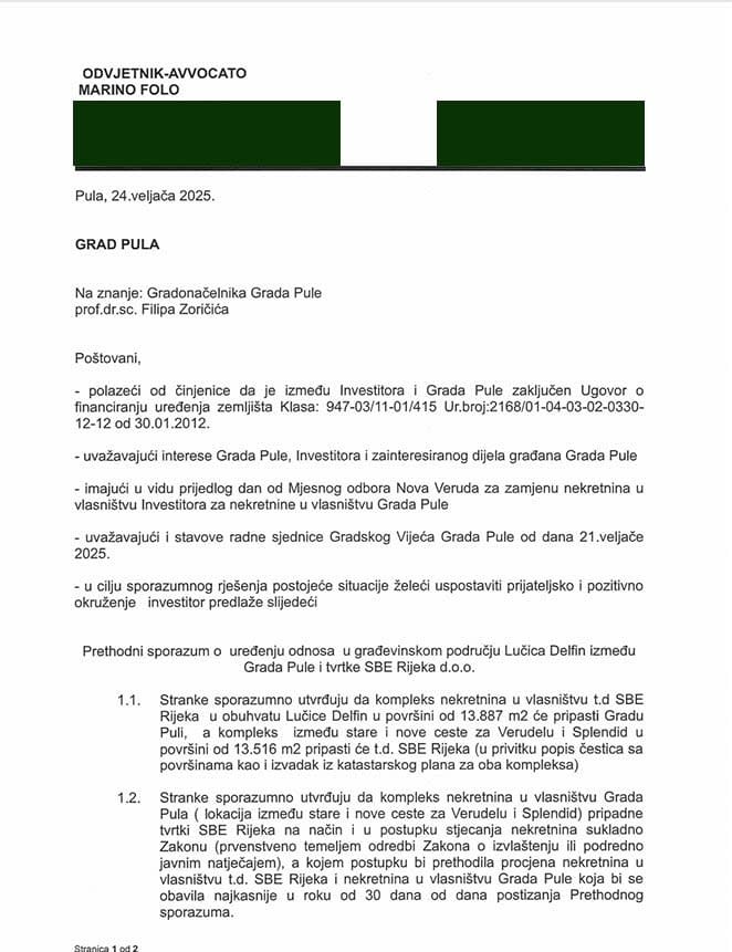 Među ostalim, u prijedlogu sporazuma koji je proslijedio investitor navodi se kako "stranke sporazumno utvrđuju da će kompleks nekretnina u vlasništvu SBE Rijeka u obuhvatu Lučice Delfin u površini od 13.887 metara kvadratnih pripasti Gradu Puli, a kompleks između stare i nove ceste za Verudelu i Splendid u površini od 13.516 metara kvadratnih tvrtki SBE Rijeka".