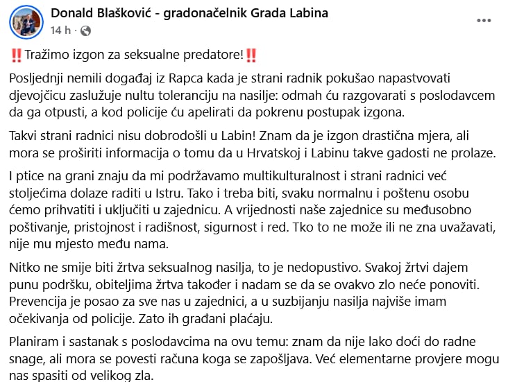 "Odmah ću razgovarati s poslodavcem da ga otpusti, a kod policije ću apelirati da pokrenu postupak izgona.Takvi strani radnici nisu dobrodošli u Labin! Znam da je izgon drastična mjera, ali mora se proširiti informacija o tomu da u Hrvatskoj i Labinu takve gadosti ne prolaze", naveo je Blašković i dodao: