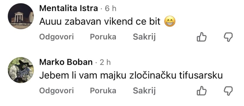 Snimke ekrana ('screenshot'-ove) spornih objava na društvenima mrežama, policiji je prilikom prijave festivala poslao voditelj Antifa festivala Deni Kukolj, koje mi ovdje prenosimo: