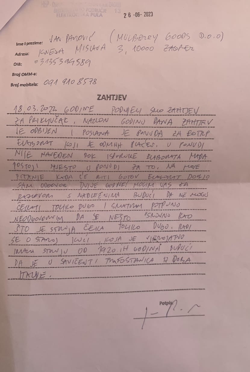 Nakon cijele godine bačene u vjetar, dobio je, veli, odbijenicu za priključak, uz obrazloženje da mora izraditi Elaborat optimalnog tehničkog rješenja priključenja (EOTRP).