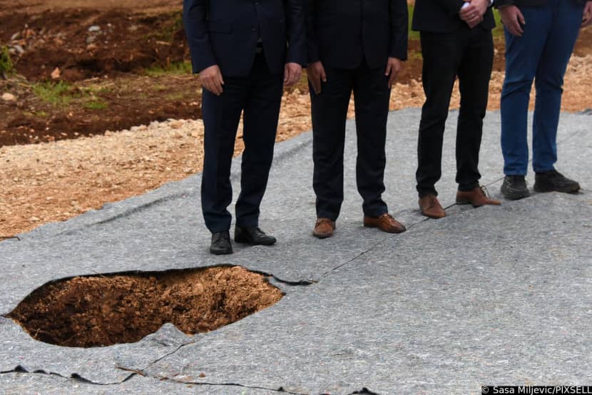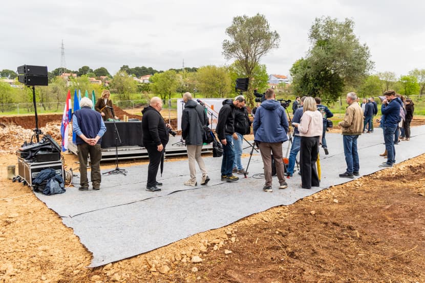 Preko tek raskopane i svježe pokisle zemlje za događaj je postavljen tepih. Ne svečani crveni, doduše, već zaštitni sivi, koji je, prekrivši stotinjak kvadrata njive, trebao omogućiti hodanje po suhom za novinare i ugledne uzvanike.