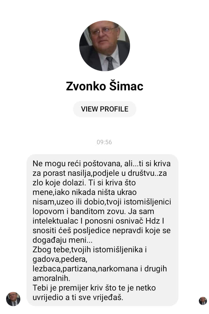 -Nakon što sam javno progovorila o verbalnom napadu koji mi se jučer dogodio u dućanu, u Messenger mi se javio stanoviti “intelektualac i ponosni osnivač HDZ-a” i optužio me za porast nasilja te je rekao da ću snositi posljedice.
