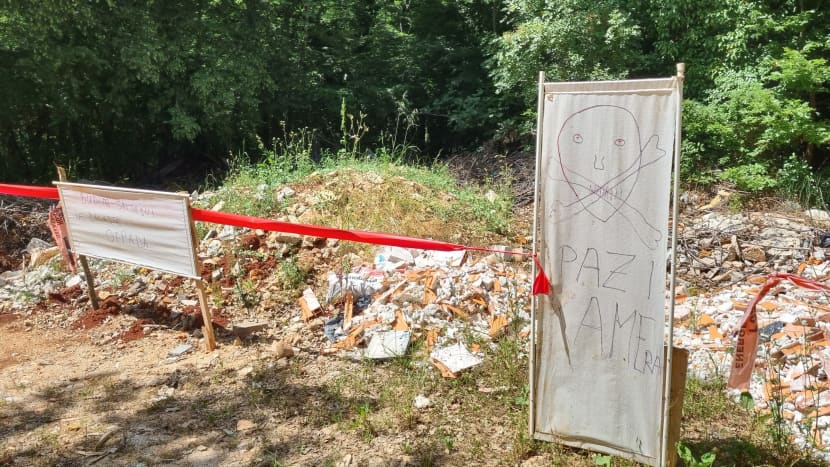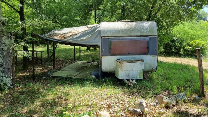 S uskog bijelog puteljka jedva dovoljnog za prolazak jednog automobila, prvo što upada u oči su hrpe građevinskog otpada i brojne trošne kamp prikolice skrivene u gustišu.