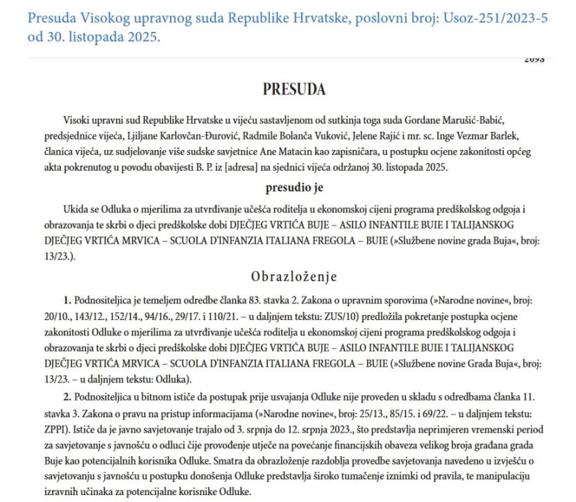 Visoki upravni sud Republike Hrvatske krajem prošlog mjeseca donio je presudu da se ukida Odluka o mjerilima za utvrđivanje učešća roditelja u ekonomskoj cijeni programa predškolskog odgoja i obrazovanja te skrbi o djeci predškolske dobi Dječjeg vrtića Buje.
