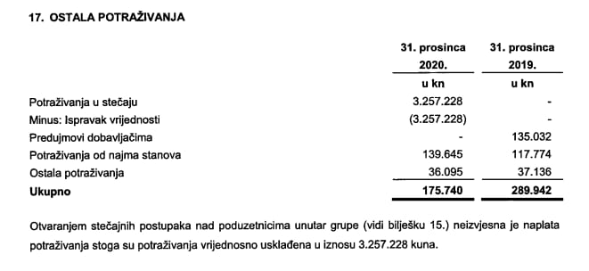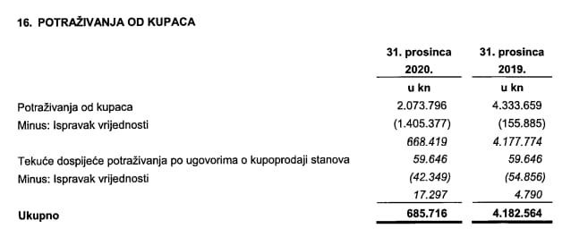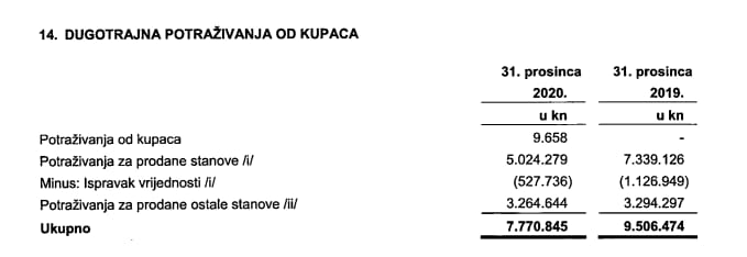 Međutim, u bilanci su iskazana dugotrajna potraživanja od kupaca u iznosu od 9,5 milijuna kuna te kratkoročna potraživanja u iznosu od 4,1 milijuna kuna. Dugoračna potraživanja se odnose na prodane stanove.