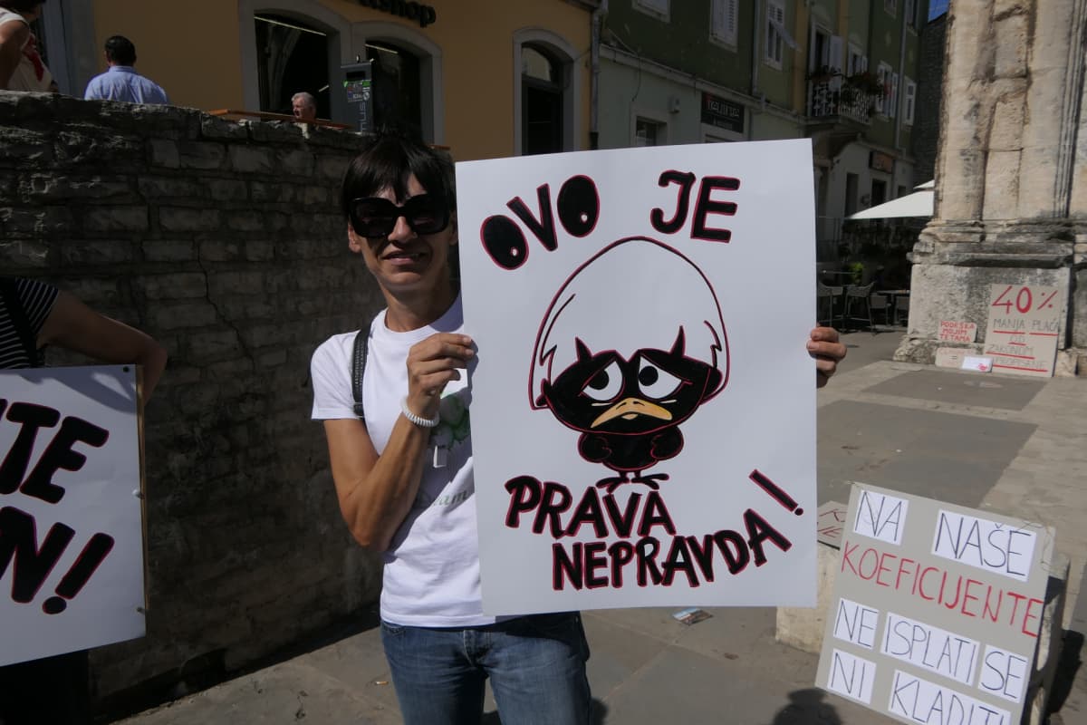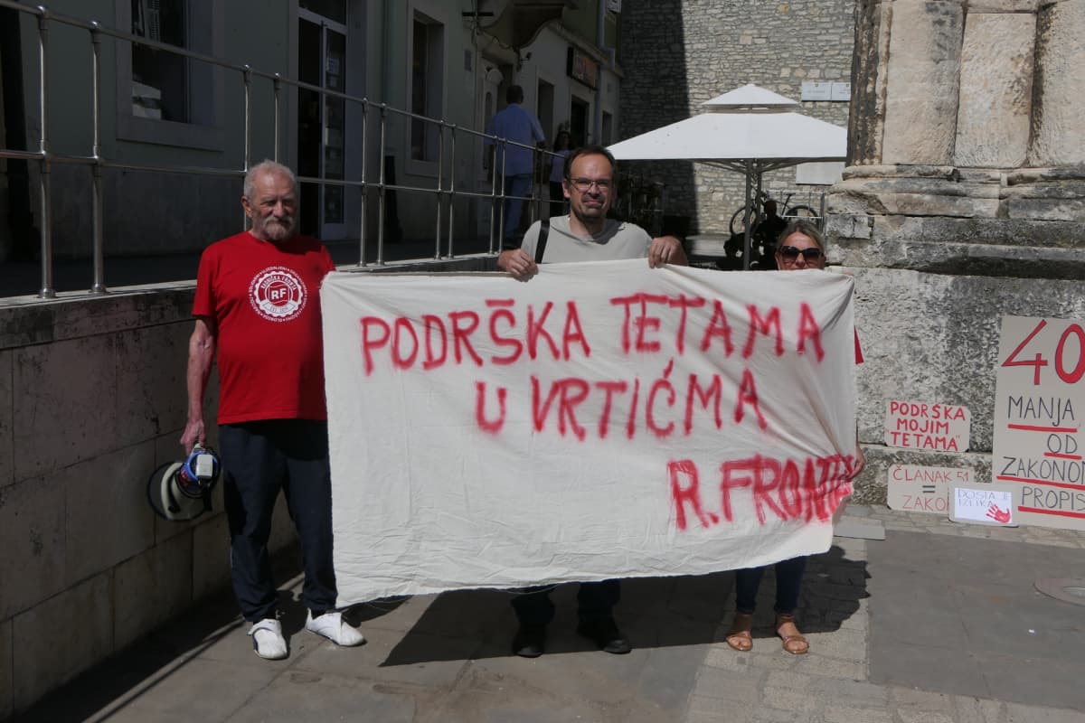 Rajko Kutlača iz Sindikata Istre, Kvarnera i Dalmacije je kazao da su protest organizirali na današnji dan jer vrtići danas ne rade, te su zbog toga prisutni djelatnici vrtića. Poručio je da su s Portarate došli na Forum kako bi odaslali poruku nadležnima iz Grada Pule.