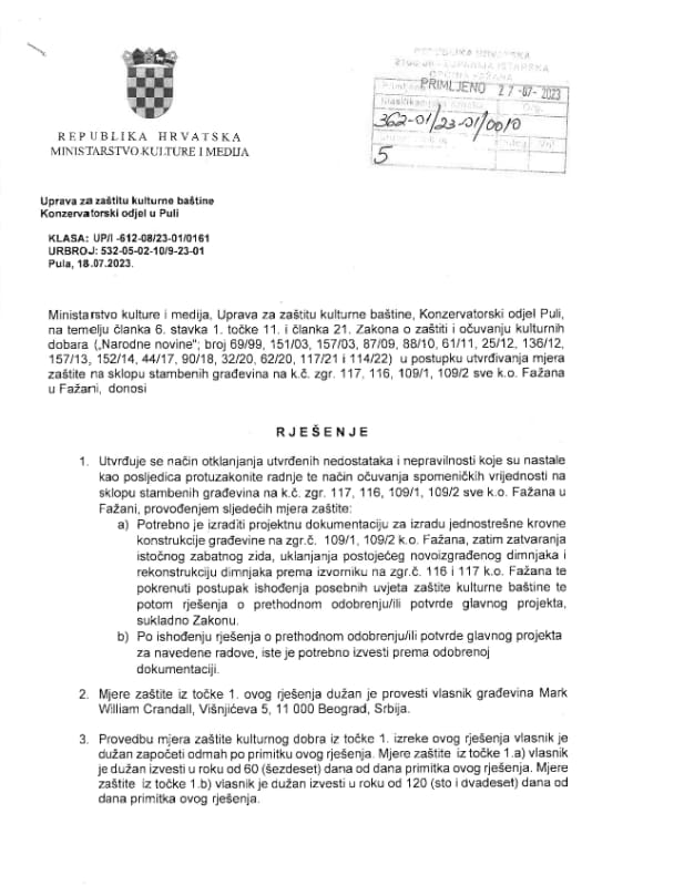 - Općina Fažana-Fasana zaprimila je Rješenje Ministarstva kulture i medija, Uprave za zaštitu kulturne baštine, Konzervatorskog odjela u Puli, od 18. srpnja 2023. godine, kojim je, u bitnome, utvrđen način otklanjanja nedostataka i nepravilnosti koje su nastale kao posljedica protuzakonite radnje na k.č.br. zgr. 117 i dr. sve k.o. Fažana u vlasništvu Marka Williama Crandalla, a koje su nekad bile u vlasništvu Lidije Zulme Udovički Sanchez de Lozada, te se nalaze u povijesnoj jezgri Općine Fažana, stoji u općinskom priopćenju za medije.