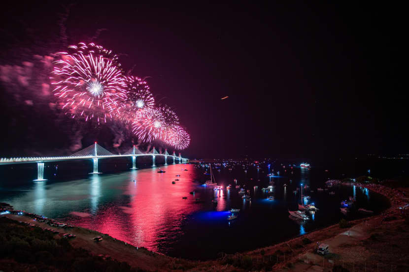 Cjelodnevni svečani program koji se odvijao s obje strane mosta, na odmorištima Brijesta i Komarna, završio je izvedbom "Himne slobodi" i velikim vatrometom, nakon čega je uslijedilo svečano otvaranje 2404 metara dugačkog zdanja. Tijekom vatrometa mostom su prošla i dva automobila hrvatske proizvodnje - „Nevera” Mateja Rimca i automobil koji "gradi" proslavljeni automobilistički as Niko Pulić, sve uz pucnjavu Dubrovačkih trombunjera i zvonjavu svih crkvenih zvona u Dubrovačkoj biskupiji.