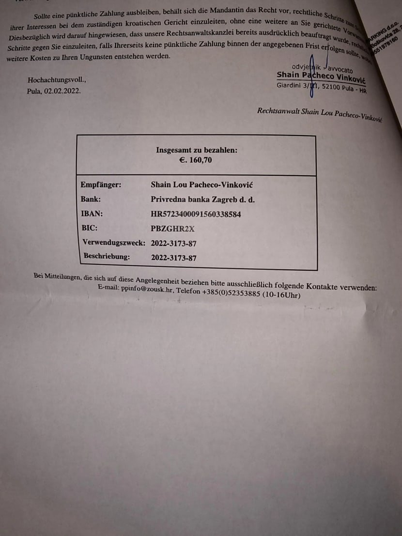 - Nazvao sam odvjetničko društvo da se raspitam odakle toliki troškovi i kako je moguće da je kazna s 48 kuna narasla na 160 eura, na što mi se javila tajnica i ponudila mi da se dogovorimo, da mi mogu umanjiti kaznu od 110 eura – tumači Tomić.