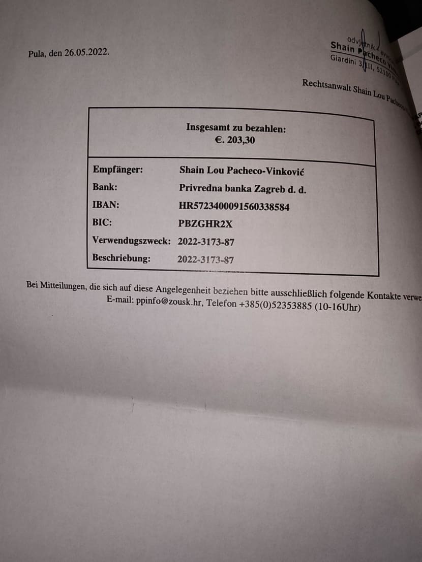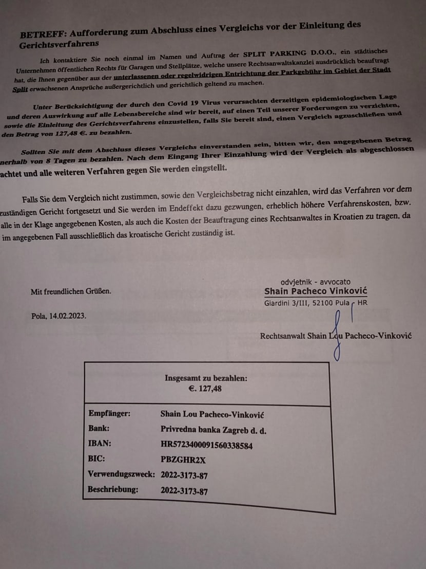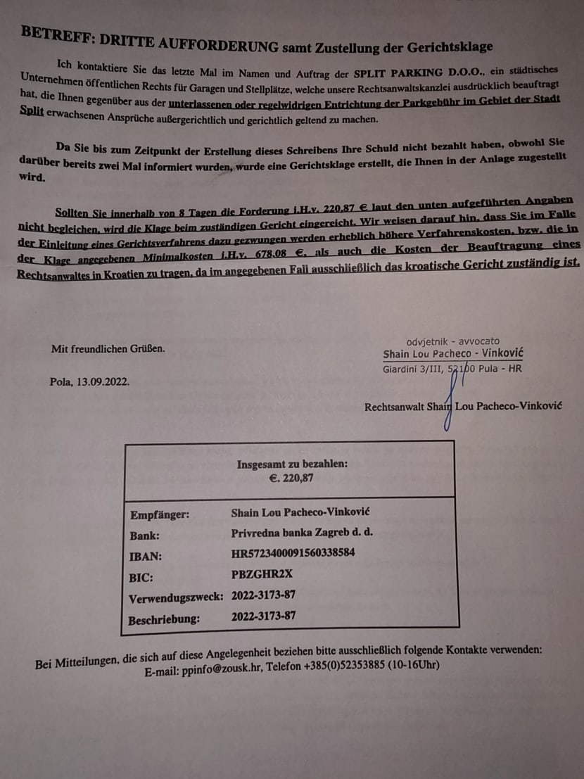 Sve je, tvrdi, uredno bilo objašnjeno. I to na njemačkom jeziku. A na kraju, masno otisnuto, iznos kazne od 160,70 eura. Po stavkama: 6,58 eura za dnevnu kartu, 85,62 eura za traženje podataka o vlasniku vozila, 34,25 eura troškovi prevođenja i 34,25 eura za poštarinu.
