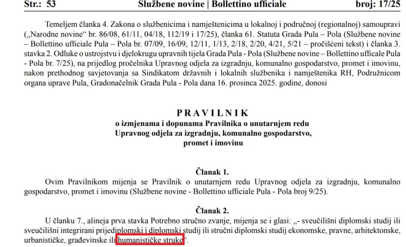 Gradonačelnik Peđa Grbin je dan prije raspisivanja natječaja za mjesto zamjenice pročelnika Odjela za izgradnju, komunalno gospodarstvo, promet i imovinu promijenio Pravilnik o unutarnjem redu tog odjela. Promjenu pravilnika predložio je pročelnik odjela Danijel Ferić 16. prosinca, dva dana kasnije promjena pravilnika objavljena je u Službenim novinama Grada Pule, da bi natječaj s novim pravilima bio objavljen 19. prosinca 2025.