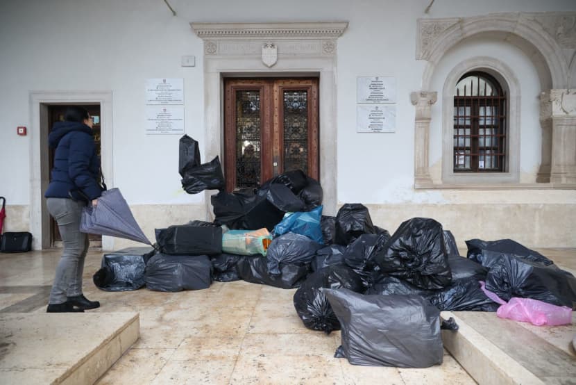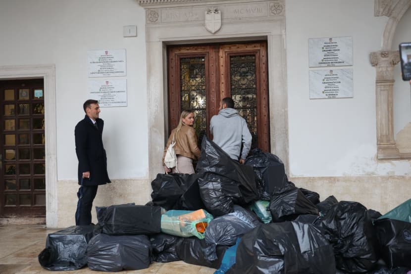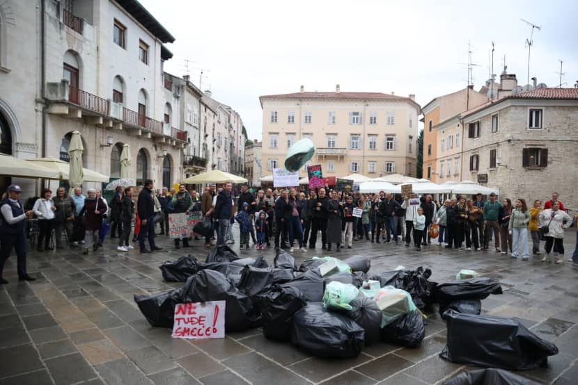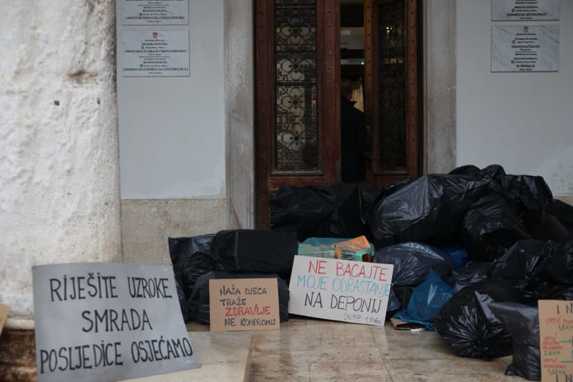Nakon prosvjednog skupa na Portarati protiv višegodišnjeg zagađenja i smrada s Kaštijuna, prosvjednici su se uputili na Forum te uoči samog početka sjednice Gradskog vijeća zatrpali smećem ulaz u Komunalnu palaču.