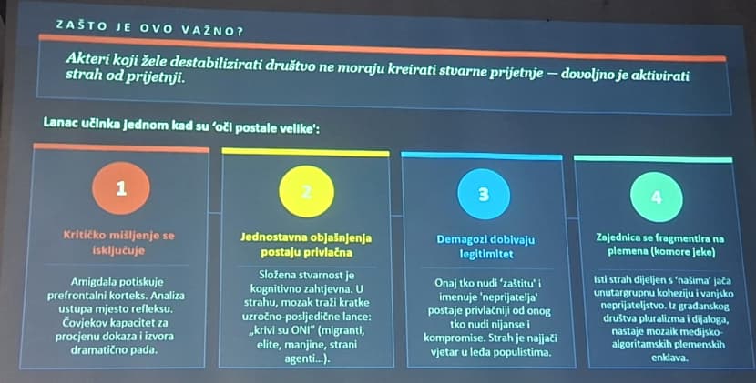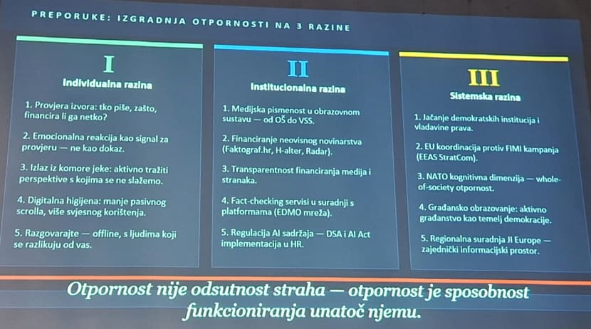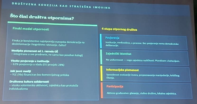 Uz vjerodostojno osvjetljavanje planskog nametanja mračne stvarnosti koju svi živimo, prof. Cvrtila je na koncu, kao izlaz, približno model u Finskoj, najotpornijoj europskoj demokraciji na dezinformacije i kognitivno ratovanje, ali i prvoj na top listi najsretnijih zemalja na svijetu.