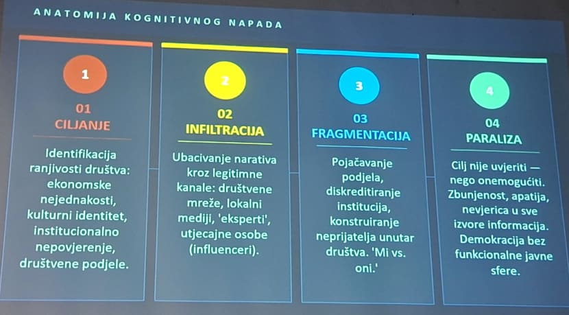 Tema njegova predavanja bila je kognitivno ratovanje, koje je NATO prije pet godina definirao kao sustavno korištenje informacija, narativa i psiholoških tehnika radi mijenjanja percepcije, uvjerenja i ponašanja ciljanog društva - bez primjene sile!