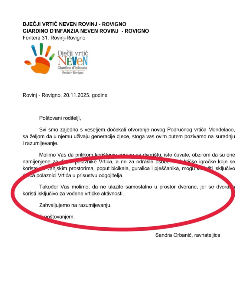 Naime, roditelji ističu da su od ravnateljice Dječjeg vrtića 'Neven' Sandre Orbanić, 20.studenog dobili službeni dopis u kojem se navodi da se dvorana može koristiti isključivo za vođene vrtićke aktivnosti, upozoravajući da se unatoč takvom dopisu, u popodnevnim satima u prostoru dvorane u organizaciji ravnateljice odvijaju rekreativne aktivnosti za odabrane.