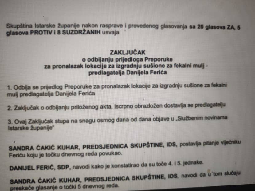 Ferićev prijedlog nije podržala IDS-ova većina s partnerima iz stranke ISU/Zeleni. SDP-ovci su glasali za, dok su vijećnici HDZ-a i Možemo-Zelena alternativa-Orah bili suzdržani.