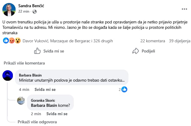 "U ovom trenutku policija je ušla u prostorije naše stranke pod opravdanjem da je netko prijavio prijetnje Tomaševiću na tu adresu. Mi nismo. Jasno je što se događa kada se šalje policija u prostore političkih stranaka", napisala je Benčić.
