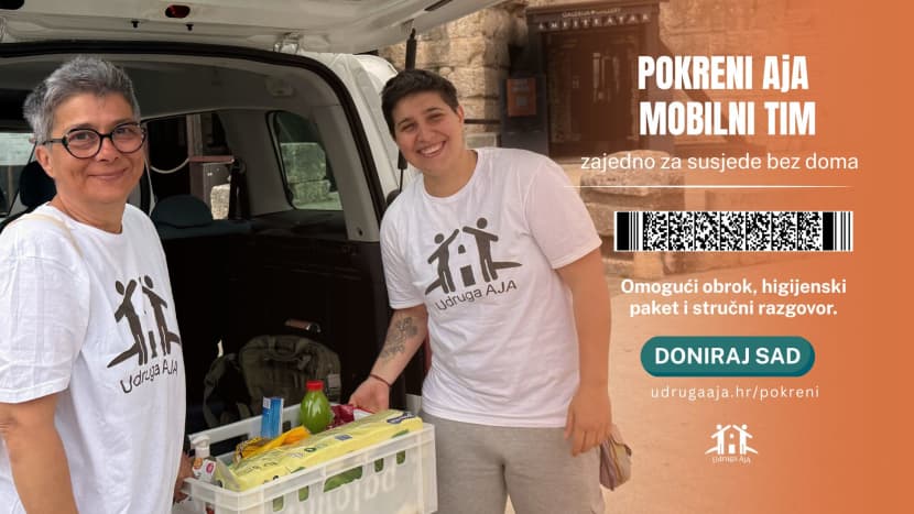 Mobilni tim Udruge AjA svakodnevno dolazi do ljudi do kojih sustav često ne dopire – pruža im podršku na terenu dostavom hrane i higijenskih potrepština, povezuje ih s pravima i uslugama te im vraća osjećaj sigurnosti i dostojanstva.