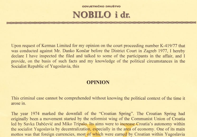 Na zahtjev tvrtke Kermas Limited za mišljenje o sudskom postupku pod brojem K-419/77 koji se vodio protiv g. Danka Končara pred Okružnim sudom u Zagrebu 1977. godine, ovim putem izjavljujem da sam pregledao spise i razgovarao s nekoliko osoba koje su sudjelovale u tim događajima te na temelju tih činjenica i mog poznavanja političkih okolnosti u Socijalističkoj Republici Jugoslaviji dajem sljedeće