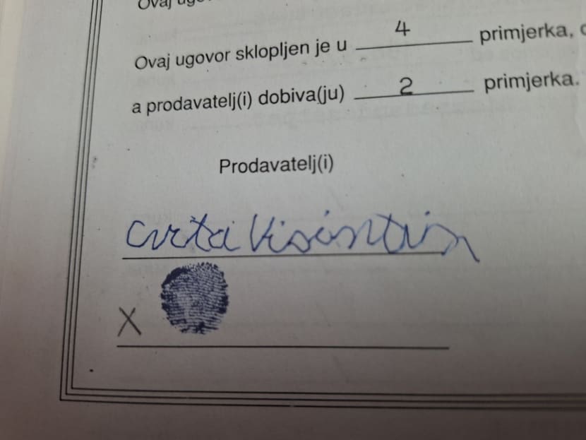 Nepismena Šimica sve je ugovore potpisala otiskom prsta. Svakim otiskom prsta potvrdila je i da joj je unaprijed isplaćena u pojedinom ugovoru navedena suma. Na ugovorima je i potpis njene kćerke Cvite iz kojeg je jasno da se radi o osobi na nivou djeteta.