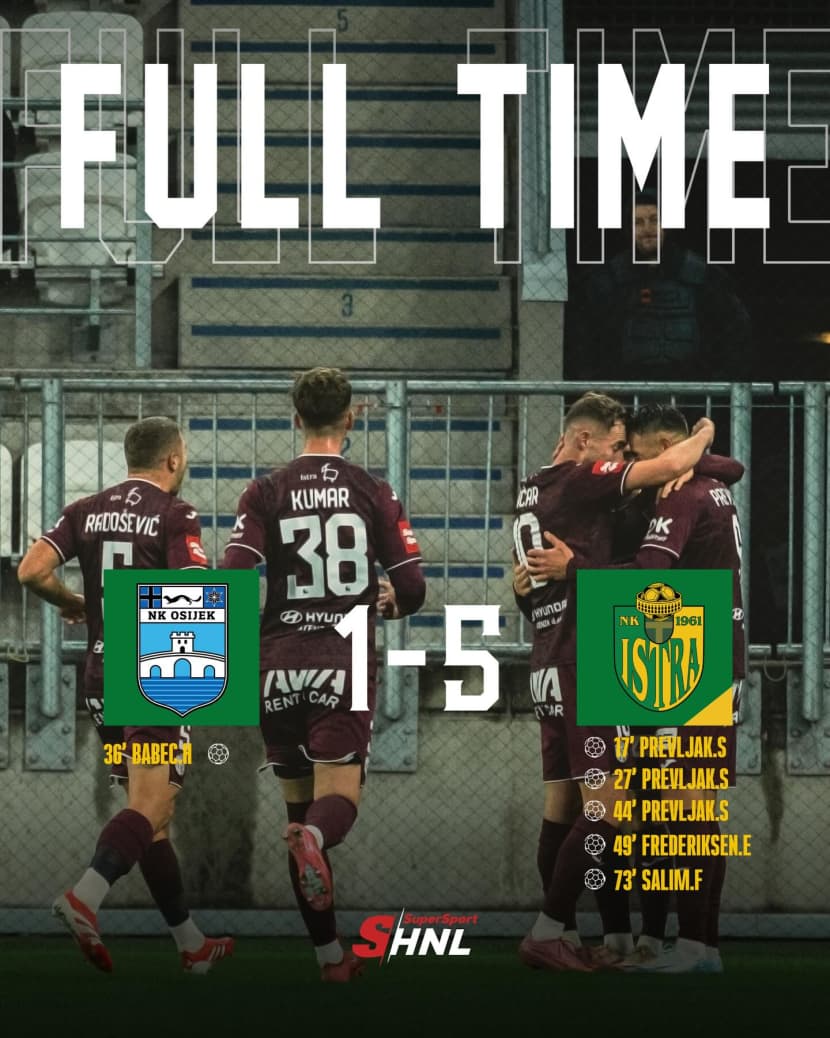 U posljednjem susretu 16. kola hrvatskog nogometnog prvenstva Istra 1961 je na Opus Areni pobijedila Osijek sa 5-1 i prvi put u povijesti zabila pet golova na nekom gostovanju u HNL-u.