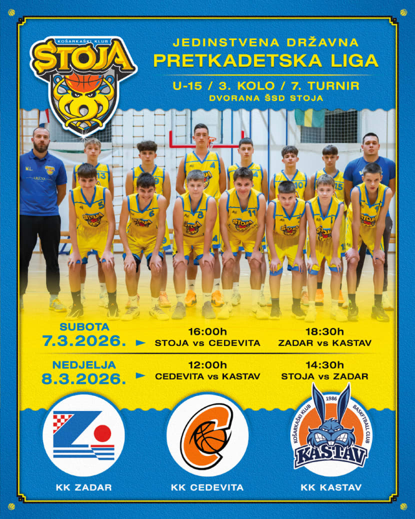 Ovog vikenda dvorana ŠSD Stoja postaje središte hrvatske pretkadetske košarke. Košarkaški klub Stoja domaćin je 7. turnira Jedinstvene državne pretkadetske lige (U-15) na kojem će, uz domaćina, nastupiti i ekipe KK Zadar, KK Cedevita Junior te KK Kastav.