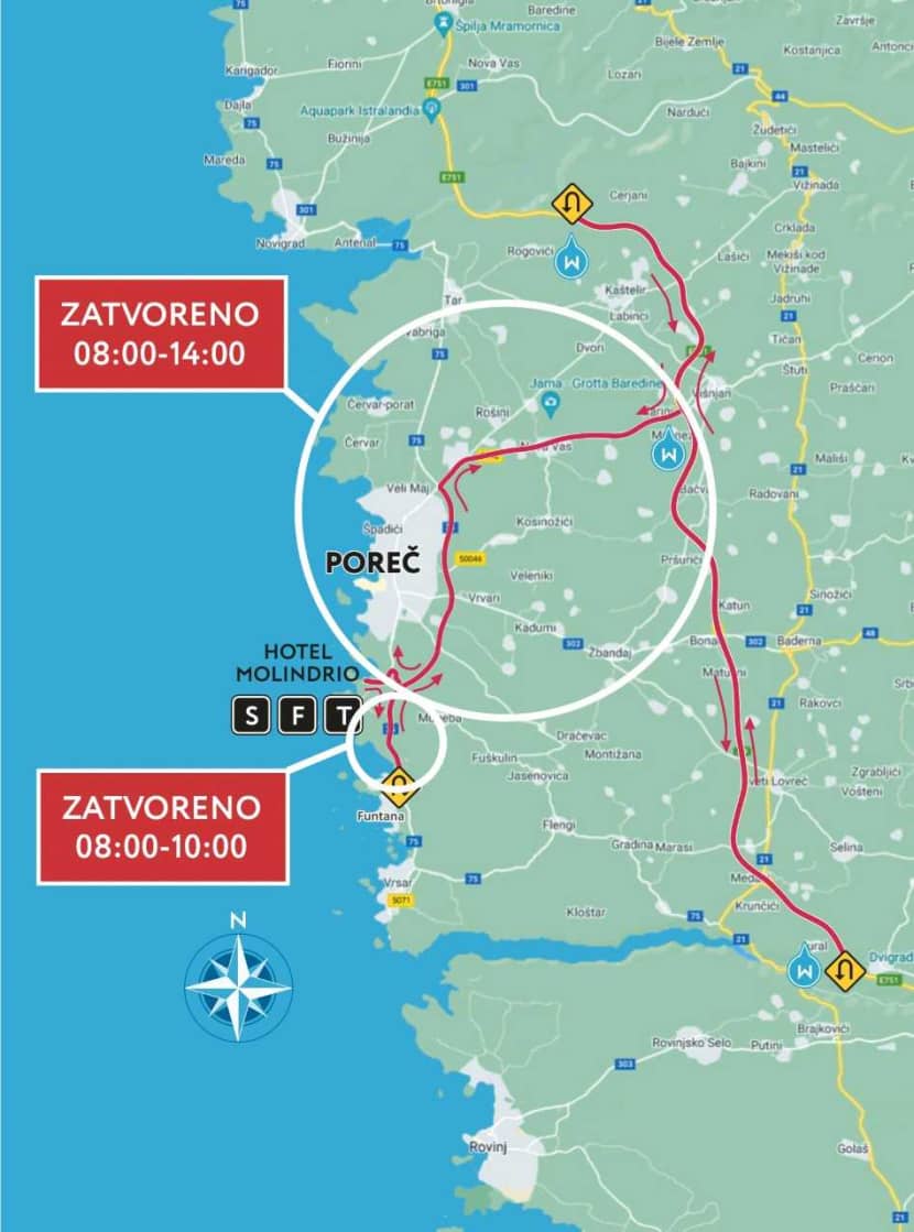 Tijekom trajanja utrke, na istarskim i porečkim cestama kojima prolaze biciklisti i trkači, na snazi će biti posebna regulacija prometa, a pojedine prometnice će privremeno biti zatvorene.