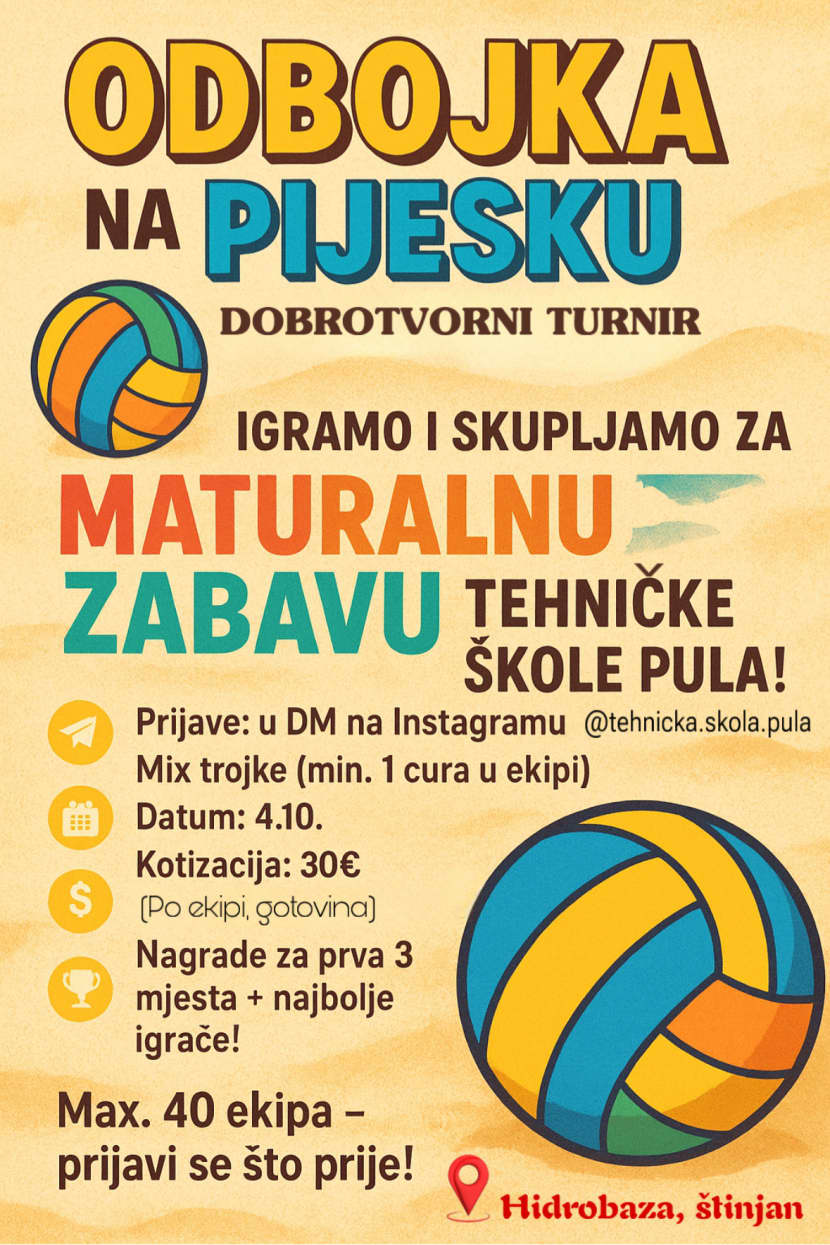 U subotu, 4. listopada, na Hidrobazi u Puli (Štinjan) održat će se dobrotvorni turnir u odbojci na pijesku. Organizatori su maturanti Tehničke škole Pula s ciljem prikupljanja sredstava za svoju maturalnu zabavu, a pozivaju sve ljubitelje sporta, dobre zabave i druženja da se priključe.