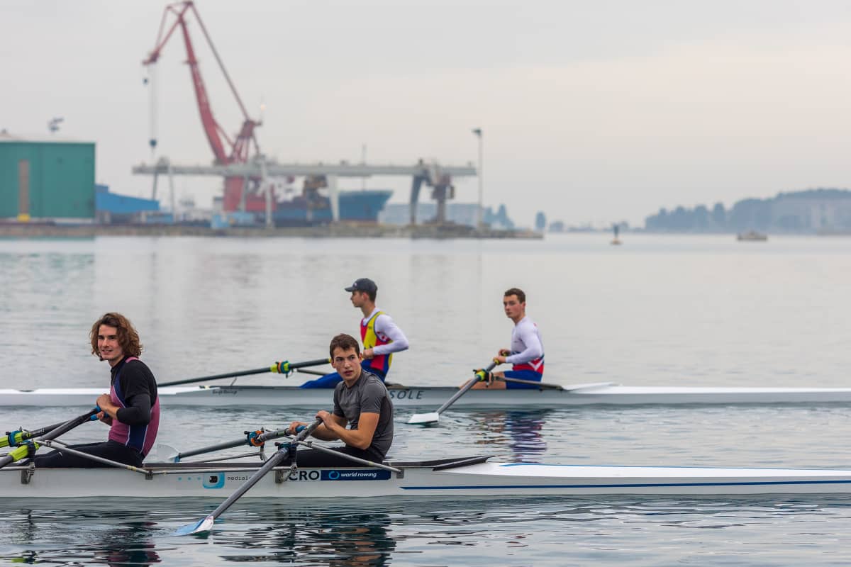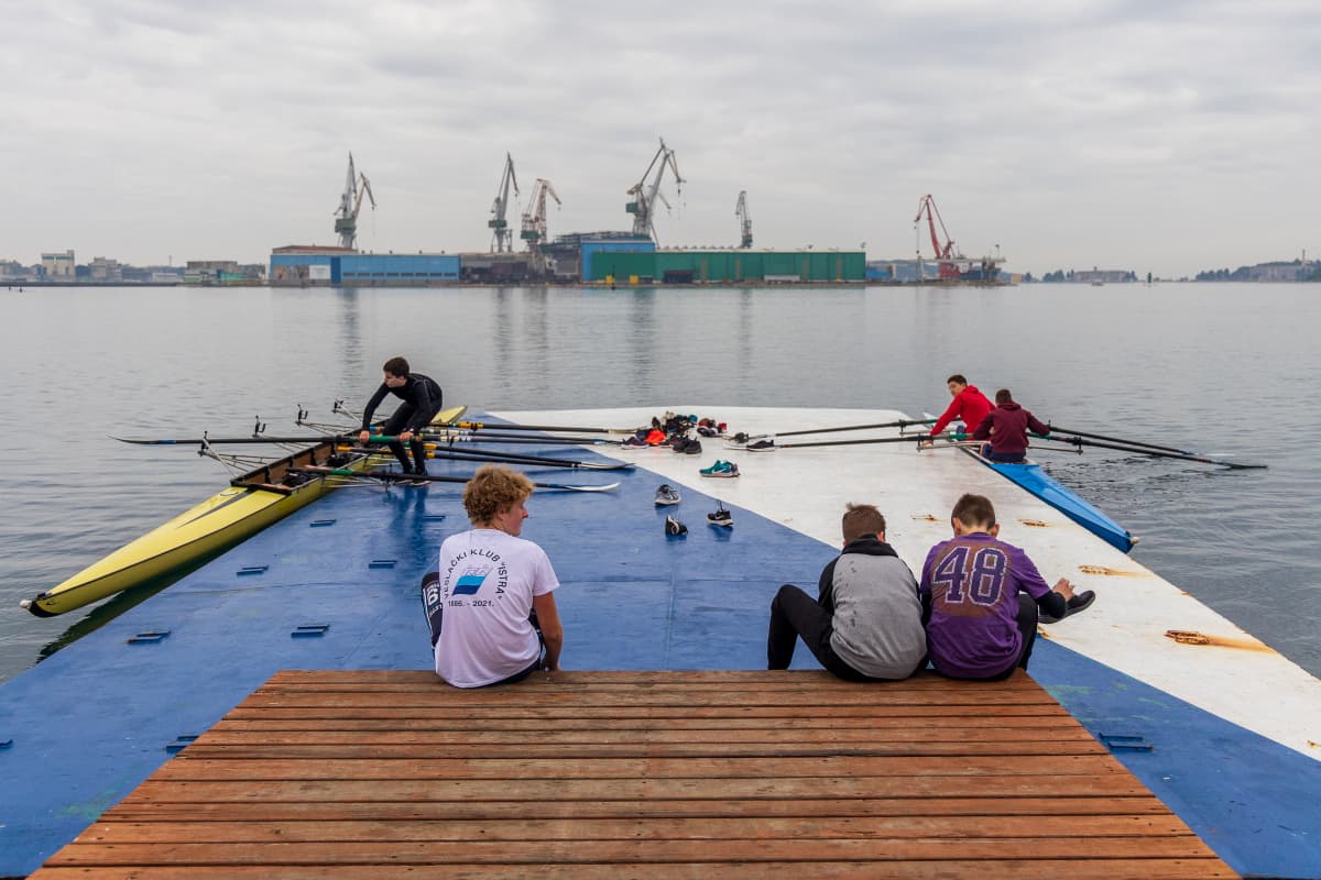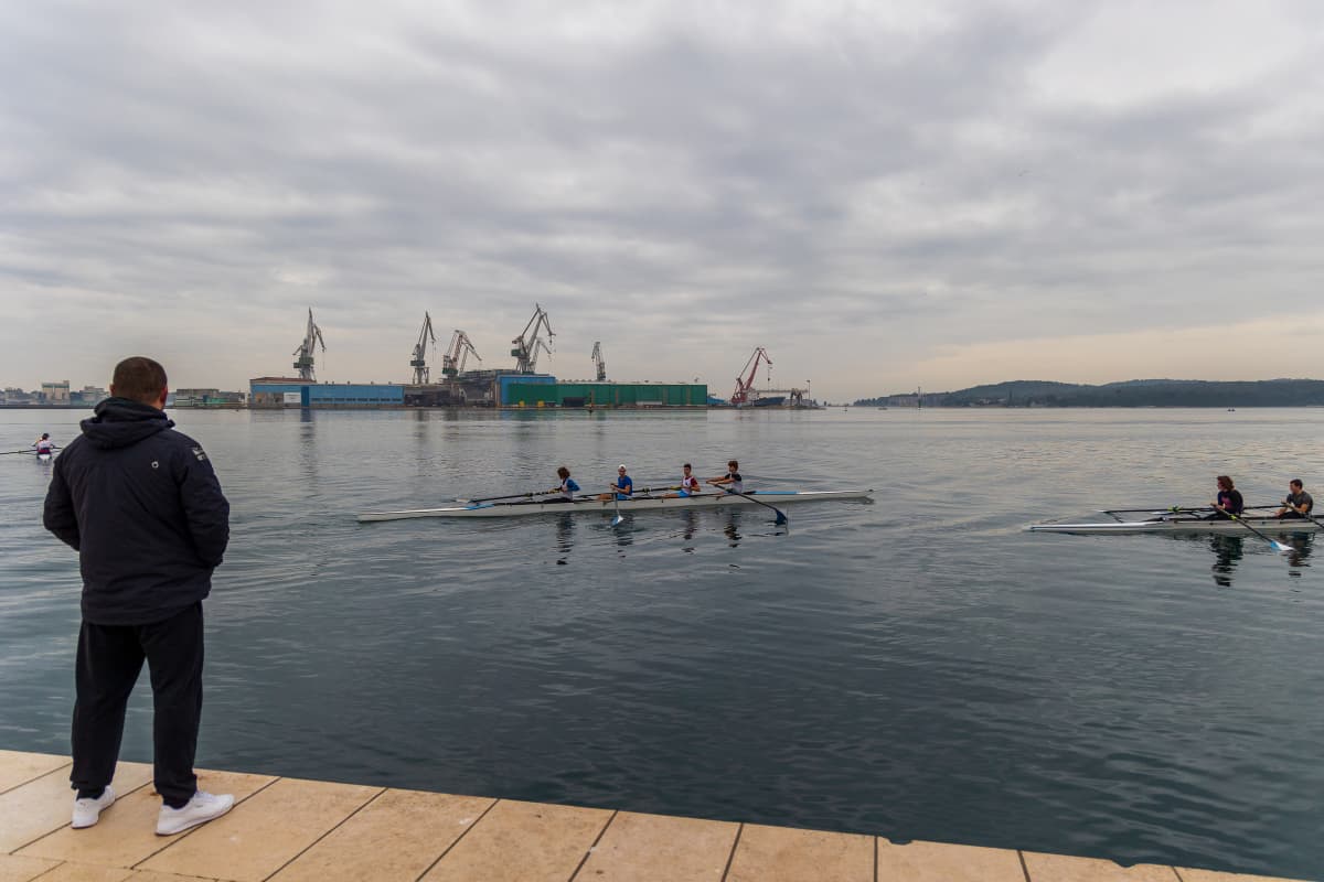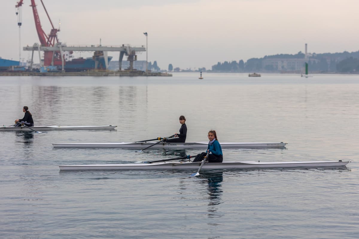 Ovdje fotografirani jutarnji treninzi veslača svih dobnih skupina sada su češći zbog aktualnih školskih praznika, koji završavaju ovog vikenda. Veslači su imali idealne uvjete, od mirnog mora do gotovo zamrlog plovnog prometa u zaljevu.