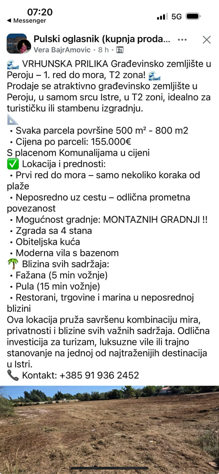 Između Peroja i Barbarige, neposredno uz lučicu Portić, prodaje se čitav grozd od pedesetak parcela veličine od 500 do 800 četvornih metara. Parcele nude mogućnost, kako kaže agentica sa oglasa, gradnje montažne kuće, zgrade s četiri stana, moderne vile s bazenom ili obiteljske kuće. Sve skupa u prvim redovima uz more.