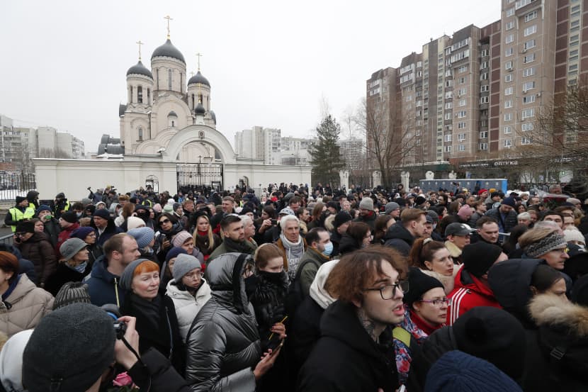 Više tisuća ljudi odalo je počast Navaljnom na groblju i ispred Crkve Ikone Majke Bože u jugoistočnoj Moskvi gdje su svećenici održali kratki obred prije nego što je tijelo preneseno na groblje. Okupljeni su u rukama držali cvijeće, a neki su skandirali: "Rusija će biti slobodna", "Ne ratu", "Rusija bez Putina", "Nećemo oprostiti" i "Putin je ubojica".