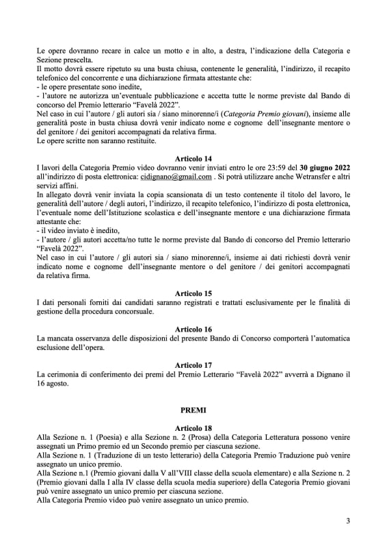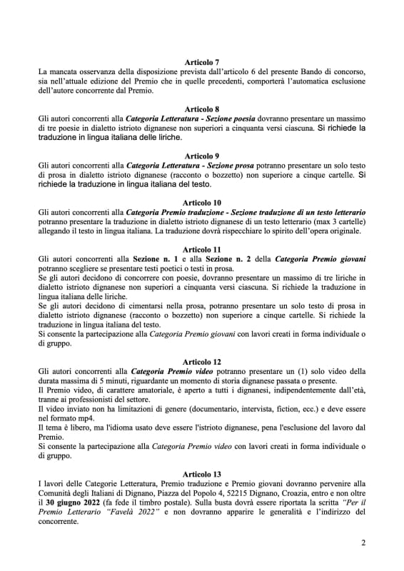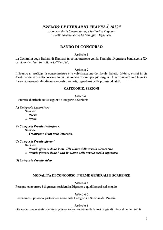 Promosso dalla Comunita' degli Italiani di Dignano in collaborazione con la Famiglia Dignanese si apre il bando di concorso per la XX edizione del Premio Letterario "Favela'".