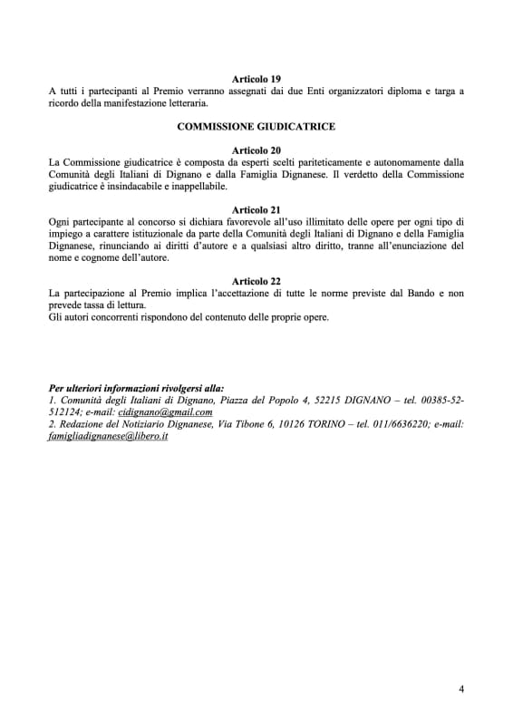 La Commissione giudicatrice è composta da esperti scelti pariteticamente e autonomamente dalla Comunità degli Italiani di Dignano e dalla Famiglia Dignanese.