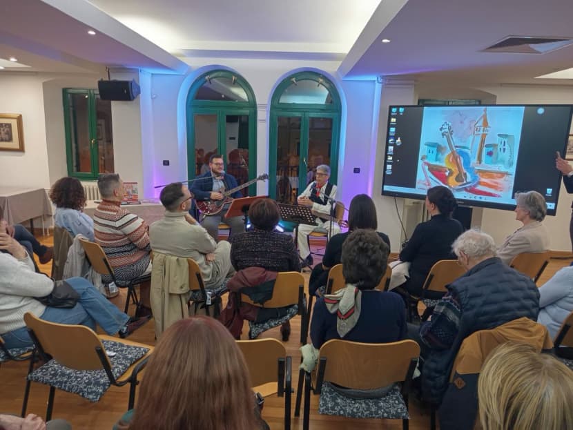 Con il fazzoletto rosso intorno al collo – tributo a Rovigno – e la sua chitarra, accompagnato dal musicolgo Alessio Giuricin al basso, in una sala gremita, sia cantando dal vivo, sia nei vari video mostrati, Bosazzi, premiato dai costanti appalusi del pubblico, ha regalato ai presenti un ampio stralcio della sua carriera nel corso della quale si sono alternate e intersecate varie scelte musicali e testuali.