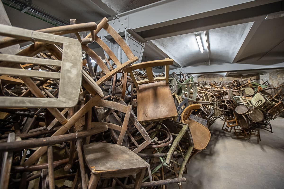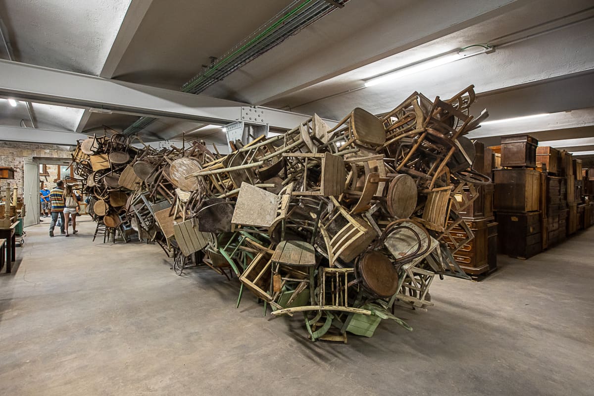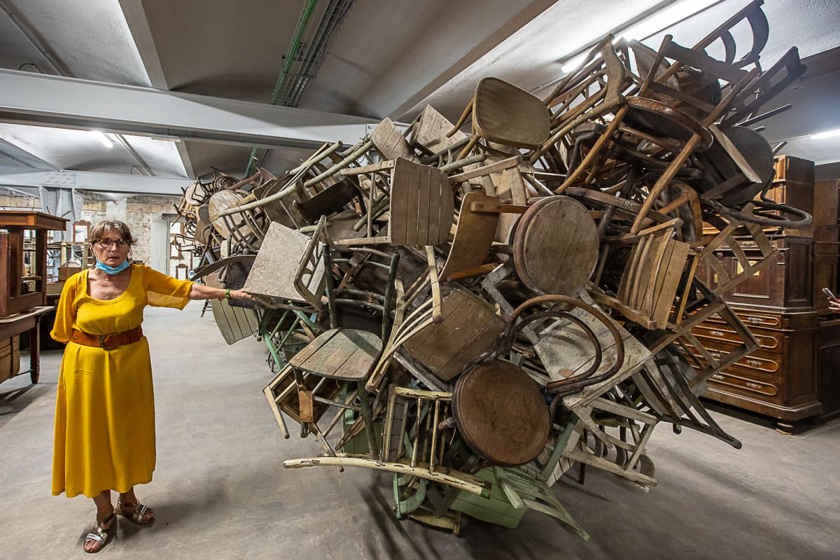 Simbolo di tutta quella gente costretta ad andarsene dalla propria terra, le sedie accatastate le une sulle altre. Simbolo di chi non c’è più.