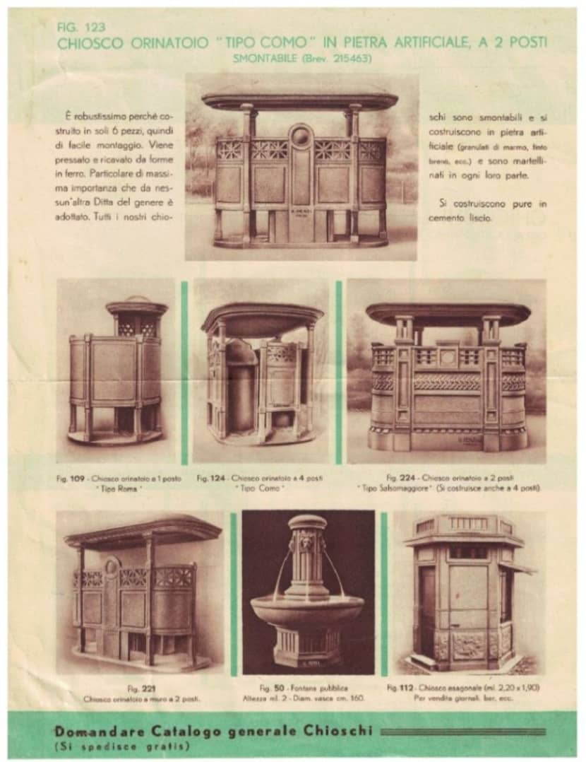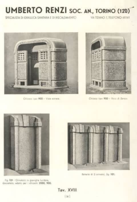Per eser in linea con moda razionalista, come riportado in tel articolo "Il “servizio pubblico per le umane impellenze" publicado sul sito Historia Foxani, la dita Renzi la ghe mandava ai podestà letere con queste parole: "Ai signori Podestà ed alle Autorità interessate, che amano e apprezzano la nuova architettura, raccomandiamo questo tipo di chiosco per quartieri d’intonazione razionale e futurista…". Ma xe de dir anche che la Renzi la gaveva in catalogo anche orinatoi de stile liberty, tipo el famoso model “Salsomaggiore”.