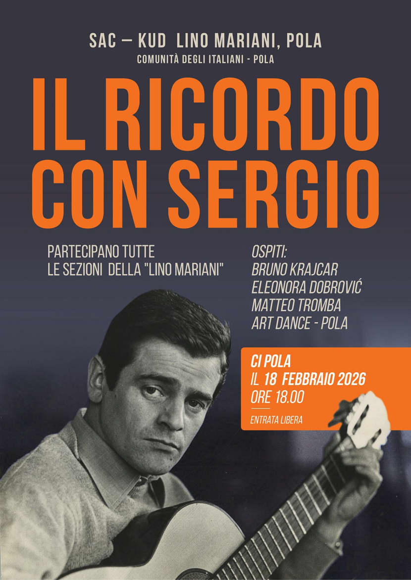 La SAC "Lino Mariani", in collaborazione con la Comunità degli Italiani di Pola, organizza l’evento “Il ricordo con Sergio”, una serata dedicata al celebre cantautore Sergio Endrigo, nato a Pola il 15 giugno del 1933 e morto a Roma il 7 settembre del 2005.