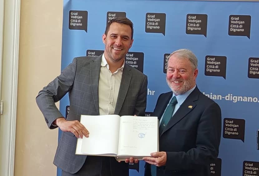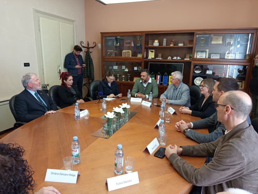 Ad accoglierlo all’incontro al Palazzo mucipale di Dignano sono stati il sindaco Igor Orlić e la vicesindaca eletta in rappresentanza degli Italiani Manuela Geissa. E c'erano anche il presidente della Comunità degli Italiani di Dignano Maurizio Piccinelli, la vicepresidente della CI di Gallesano Diriana Delcaro Hrelja, il presidente del Consiglio della minoranza italiana della Regione istriana Ennio Forlani, quello del Consiglio della minoranza italiana della Città di Dignano Fulvio Delcaro e il Console onorario d’Italia Tiziano Sošić, in rappresentanza della Console generale d’Italia a Fiume Iva Palmieri.
