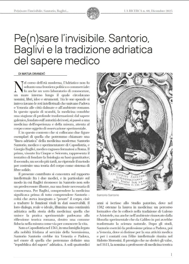 Il primo contributo è Pe(n)sare l’invisibile. Santorio, Baglivi e la tradizione adriatica del sapere medico di Matija Drandić. Nel corso dell’età moderna, l’Adriatico non fu soltanto una frontiera politica o commerciale, ma anche un vero laboratorio di conoscenze dove circolavano libri, idee e strumenti. In questo spazio, la medicina conobbe una stagione di profonde trasformazioni: dal sapere galenico, fondato sull’autorità dei testi, si passò a una medicina dell’esperienza e della misura.