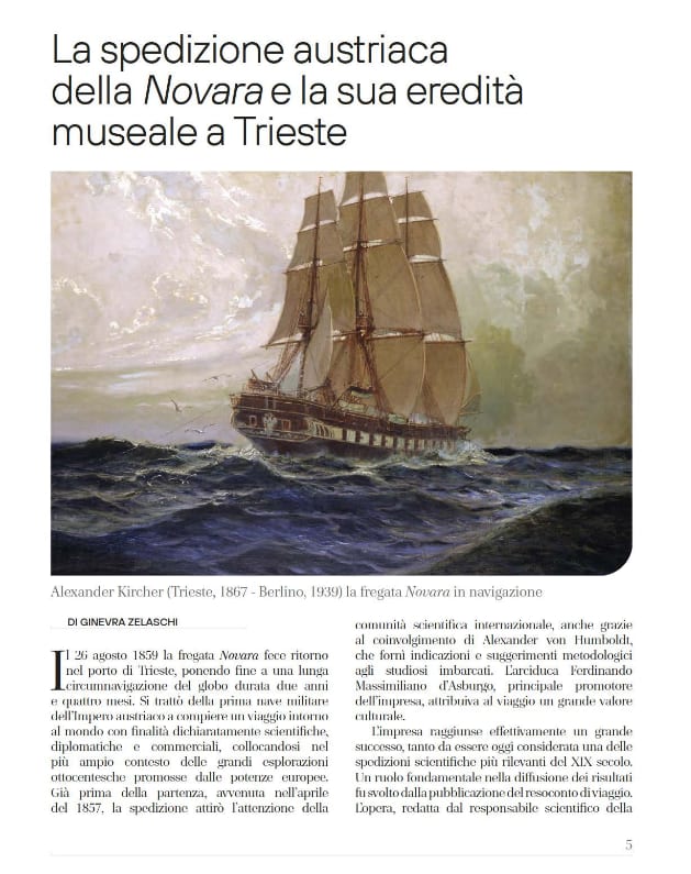 Segue Ginevra Zelaschi con La spedizione austriaca della Novara e la sua eredità museale a Trieste. Il 26 agosto 1859 la fregata Novara fece ritorno nel porto di Trieste, ponendo fine a una lunga circumnavigazione del globo durata due anni e quattro mesi. Si trattò della prima nave militare dell’Impero austriaco a compiere un viaggio intorno al mondo con finalità dichiaratamente scientifiche, diplomatiche e commerciali, collocandosi nel più ampio contesto delle grandi esplorazioni ottocentesche promosse dalle potenze europee.