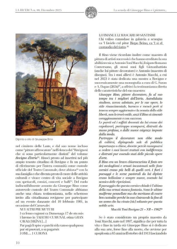 Il terzo contributo è di Susanna Bino: La scuola di Giuseppe Bino e i pictores nella Rovigno tra Otto e Novecento. A partire dagli anni Sessanta dell’Ottocento, a Rovigno si sviluppano importanti attività industriali, si potenziano le infrastrutture, si diffonde l’istruzione, si moltiplicano le associazioni, nascono tipografie. È il segno di un vivace fermento economico e sociale che dà avvio a un importante processo di riqualificazione urbana, il quale richiede maestranze specializzate. È in questo contesto che emerge la figura e l’opera di Giuseppe Bino, pittore e decoratore formatosi a Trieste e trasferitosi stabilmente a Rovigno nel 1863.