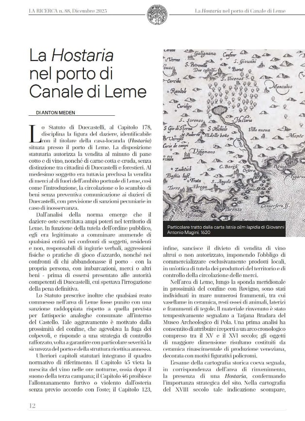 Conclude Anton Meden con La Hostaria nel porto di Canale di Leme. Il contributo prende avvio da un ritrovamento lungo la sponda meridionale di Leme, al confine che oggi divide Rovigno da Canfanaro, dove l’autore ha rinvenuto in mare frammenti ceramici, resti ossei e materiali edilizi. I reperti sono verosimilmente collegabili alla presenza dell’Hostaria nel porto di Leme, evidenziata nella cartografia storica e menzionata nello Statuto di Duecastelli, dove al Capitolo 178 viene regolata la figura del daziere-oste, titolare della locanda. Il contributo si presenta come uno studio preliminare: l’analisi dei materiali archeologici potrà chiarire la natura, l’esatta ubicazione e l’importanza della locanda all’interno del sistema portuale e di confine di Duecastelli.