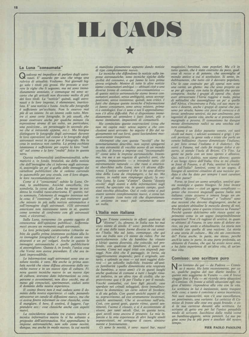 El 2 novembre, giorno dei morti, xe passai 50 anni da quela note sensa luna che i ga copà Pier Paolo Pasolini, el scritor e regista italian. El iera un omo de testa sai bona, tropo avanti rispeto al proprio tempo ma, in vita, sai maltratà e perseguità (anche dai tribunai) perché el iera omossessual, smontador de ipocrisie e dissacrator de moralismi borghesi e critico nei confronti dei intrighi del potere e dela nova società italiana che la se svilupava senza portar progresso. Per capirse, anche un tumor el pol sviluparse, ma sto svilupo no xe un progesso per l’organismo.