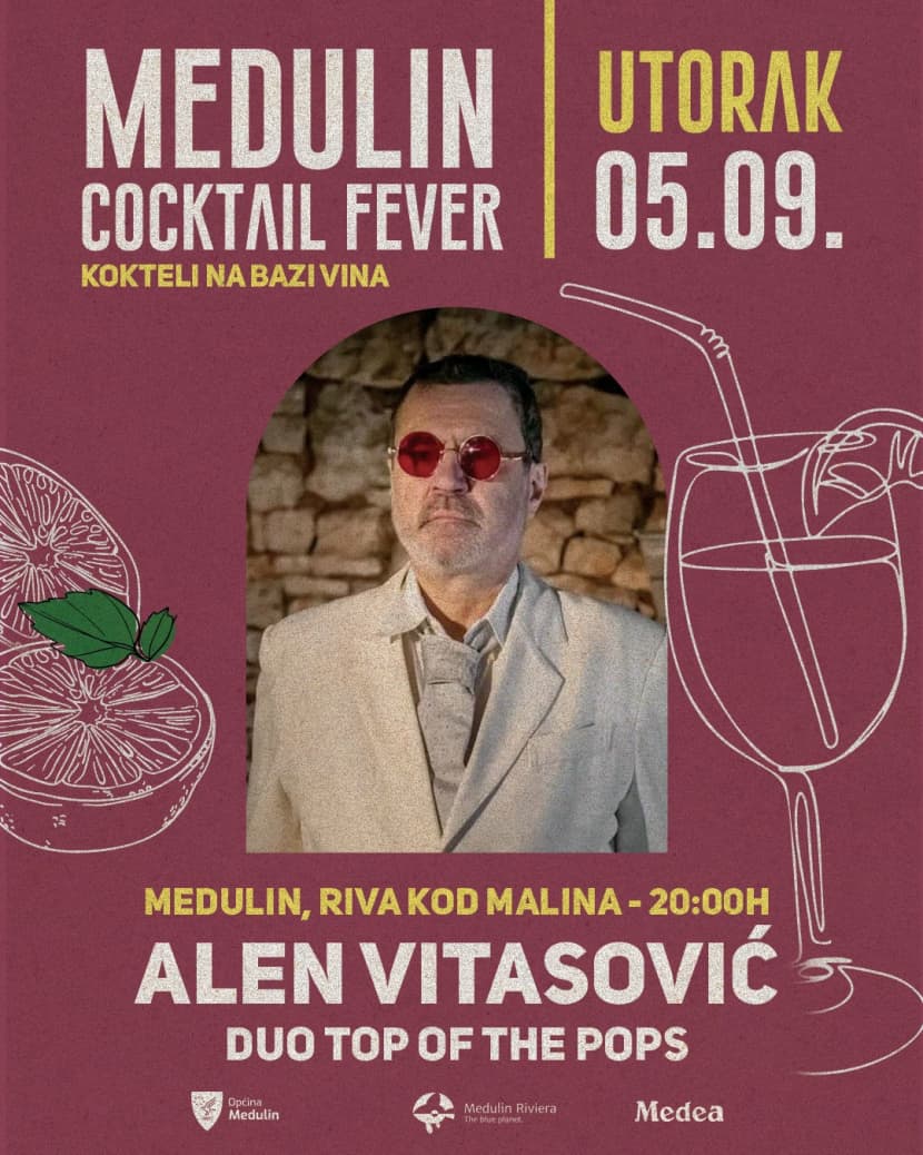 Ljetni eventi Medulin Riviere još traju. Ovog utorka, 5. rujna s početkom u 20:00 sati, kod Malina je na programu su Medulin Cocktail Night i koncerti Alena Vitasovića, koji će izvesti svoje poznate hitove i dua Top Of The Pops.
