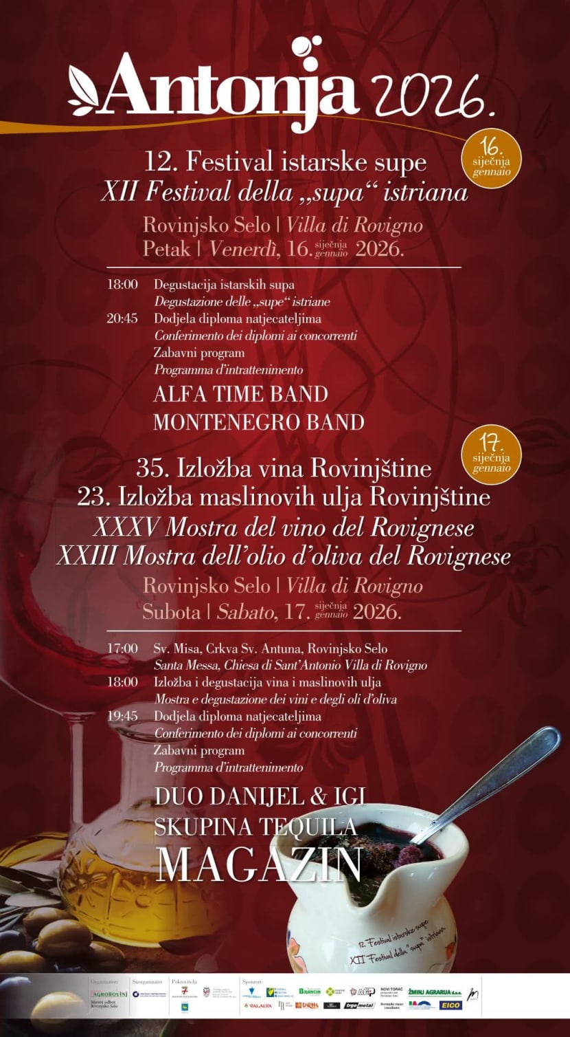 Manifestacija Antonja 2026. i ove godine donosi bogat program koji spaja tradiciju, gastronomiju i zabavu. U petak, 16. siječnja, održava se 12. Festival istarske supe, koji započinje u 18 sati degustacijom istarske supe i natjecanjem u njezinoj pripremi. Uslijedit će pozdravna riječ u 19 sati, dok je proglašenje najboljih istarskih supa i dodjela diploma predviđeno u 20:45 sati. Večer će biti upotpunjena zabavnim programom uz Alfa Time Band i Montenegro Band.