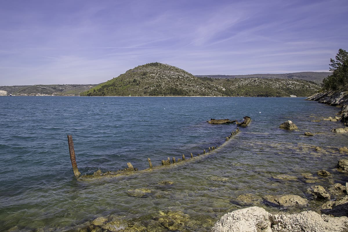 Dalje, prolazeći uz strmu obalu šumskim putevima i kozjim stazama stiže se do šljunkovite uvale Salamuštica koja skriva potopljeni njemački patrolni brod iz Drugog svjetskog rata čiji se ostaci naziru iznad površine mora.