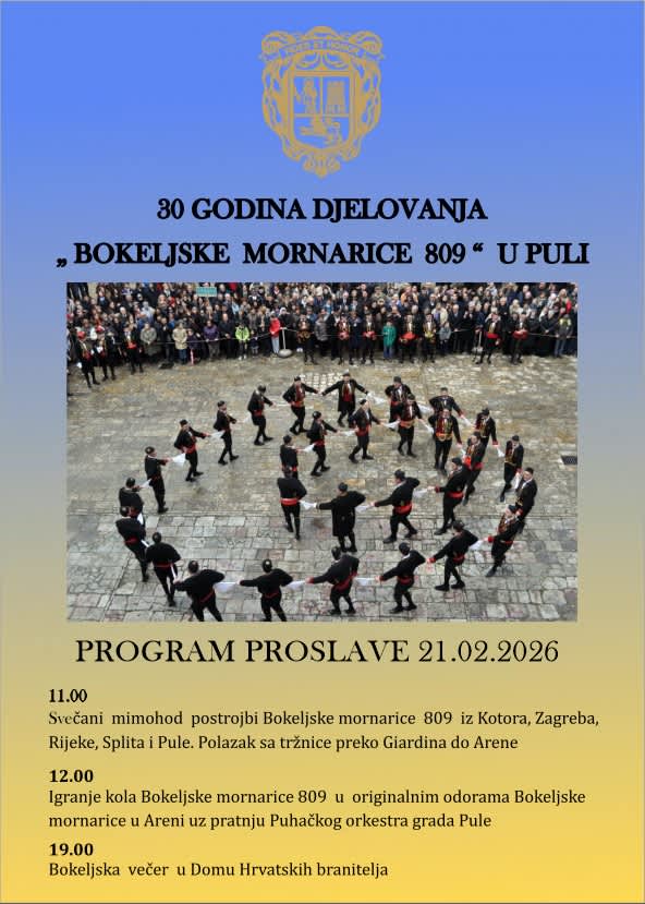 Pozivamo sve zainteresirane sugrađane i posjetitelje da se pridruže ovoj svečanosti, poprate mimohod gradskim ulicama te uživaju u nastupu Bokeljske mornarice u jedinstvenom ambijentu pulske Arene.
