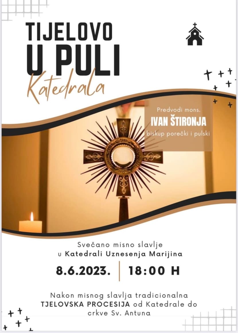 Svetkovina Tijelova je u Puli tradicionalno proslavljena Svečanim misnim slavljem u pulskoj prvostolnici, katedrali Uznesenja Marijina, a danas će svečano misno slavlje početi u 18 sati. Nakon mise sljedi tradicionalna tjelovksa procesija od katedrale, Rivom, Ulicom sv. Ivana, Ulicom Dubrovačke bratovštine te Scalierovom ulicom do crkve sv. Antuna Padovanskog. Slavlje će predvoditi biskup porečki i pulski Ivan Štironja.