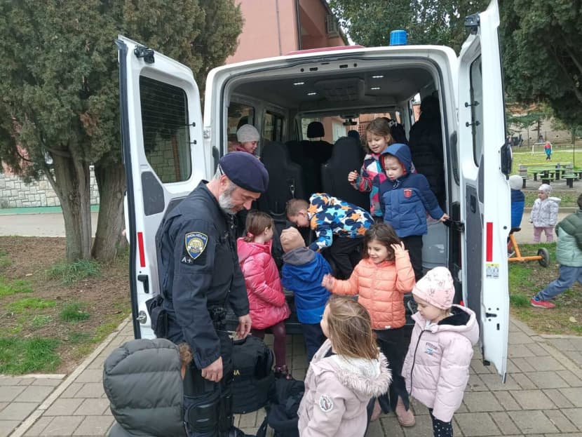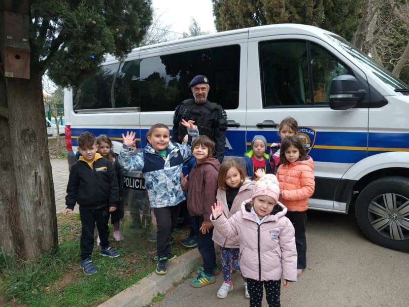 Dječji vrtić Sunce u Fažani jučer je posjetio jedan poseban tata. Policijski službenik Interventne jedinice policije Elvis Pišćak došao je s policijskim vozilom i opremom koju koristi interventna policija te je mališanima pokazao što radi ''tata policajac''.
