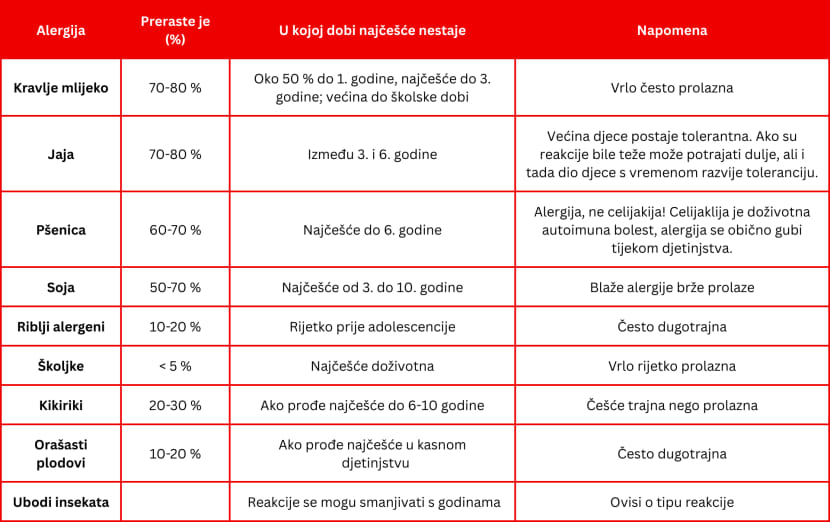 Alergije na kravlje mlijeko, jaja, pšenicu i soju u većini slučajeva prolaze, i to značajno češće nego alergije na kikiriki, orašaste plodove ili ribu. Redovita kontrola kod alergologa omogućuje praćenje napretka i procjenu kada je sigurno pokušati ponovno uvođenje.
